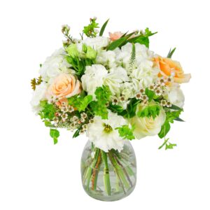 A light and lively bouquet of white roses, hydrangeas, lisianthus and the unmistakable appearance of fresh daisies. Finished with viburnum and eucalyptus for a fragrant kick, this bouquet is truly irresistible.