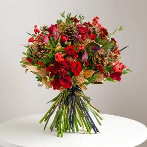 If a traditional Christmas display is what you have been searching for, you can look no further. The Festive Days bouquet embodies the essence of the festive period, featuring ilex, pinecones, gold skimmia and fresh red roses.