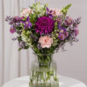 A delightful blend of rich hues and eclectic textures, featuring purple Chrysanthemums and Alstroemeria with soft peach Carnations. Graceful Antirrhinum and purple Clematis add the perfect finishing touch to this harmonious arrangement.