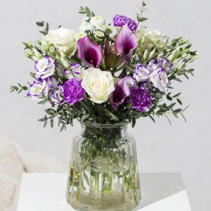 An exquisite collection of elegant Calla Lilies and vibrant purple blooms. This bouquet showcases striking Calla Lilies paired with rich purple Carnations, delicate Lisianthus stems and pure white Athena Roses, complemented by lush greenery. Featured on ITV’s This Morning as part of their Mother’s Day flowers 2026 review! Please note colour of Calla Lily may vary slightly from image.