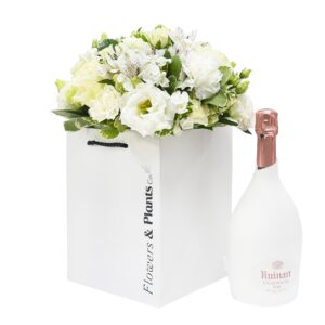 Clean, classy and suitable for every occasion, this bouquet features white lisianthus and our premium alstroemeria. Finished with fresh pittosporum & a bottle of bubbly – what’s not to like?