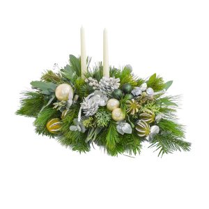 Celebrate the season with this elegant holiday centerpiece, featuring lush pine greenery, shimmering silver pinecones, white berries, and a mix of gold, green, and silver ornaments. Two tall white taper candles add a graceful touch, making it a perfect focal point for festive gatherings and Christmas decor.