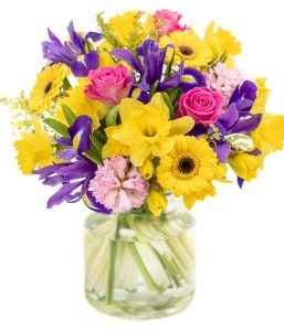 Bursting with yellow germini, pink roses and bold blue iris, this bouquet is perfect for sending a little sunshine to someone’s door. Sent via a tracked courier service in a secure Eflorist box.