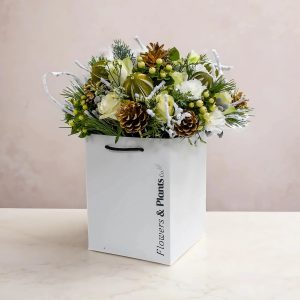 Evoking the magic of a snowy winter’s day, the White Christmas arrangement is a timelessly elegant gift. This classic white-and-green floral display features luxurious white roses, delicate carnations, frosted hypericum berries, and striking brunia – a sophisticated, fail-safe choice.